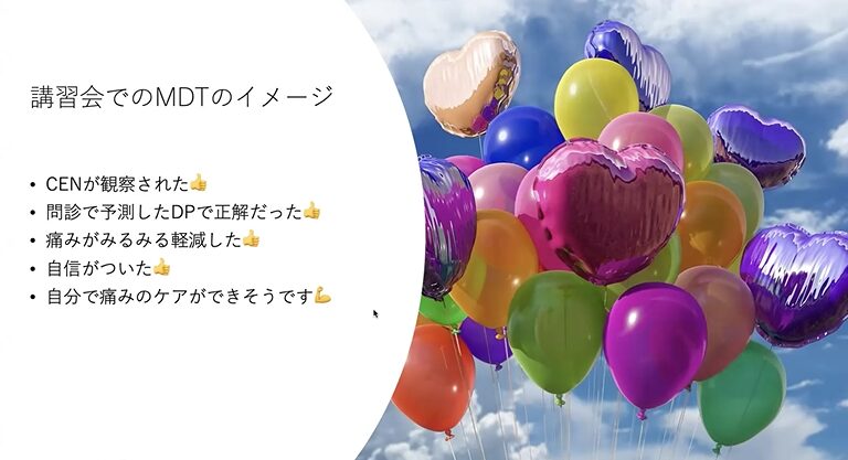 で、ですね、初めての方もいらっしゃるので、この会の趣旨なんですけども、皆さん、講習会でMDTのイメージって言ったら、centralizationが観察されたとか、DPね、問診で予測したDPで正解だったよとか、痛みがみるみる改善しましたとか、自信がつきましたって患者さんも言ってるし、自分で痛みのケアができそうです。パンパカパーンっていう、大体そういう風に構成するんです。