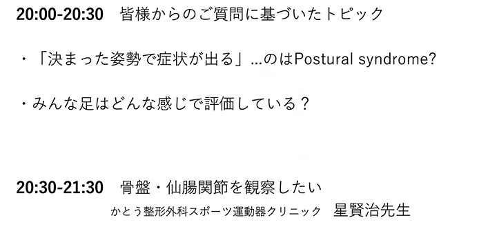で、ですね、今回はケーススタディっていう形ではなくて、前半に皆さんからね、ご質問いただいたもののトピックを2つほど取り上げさせていただいて、8時半ぐらいから、星健二先生ね、先生に、骨盤周囲の仙腸関節のことをちょっと概要っていう感じで、ちょっと泣きついてお願いしたというところなので、楽しんでいただければと思います。
