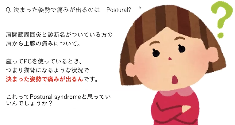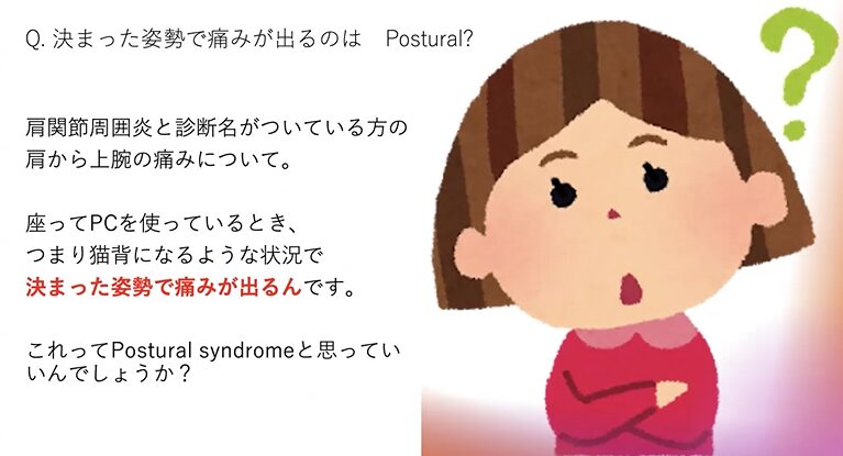 肩関節周囲炎って診断名がついてる方の、肩から上腕の痛みなんですけど、で、座ってパソコン使っている時に、要はその悪い姿勢になっちゃってるような時、決まった姿勢で、痛みが出るんですって言って、こういったものは、Postural synd.って言うんでしょうかっていうご相談でした。