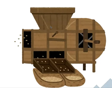 要は、脱穀するような感じ、中に入れて、ガラガラガラって、ふいにかけて、いらんもん取って、お米出してくっていう、そういう精米に使ってた道具なんですけども、