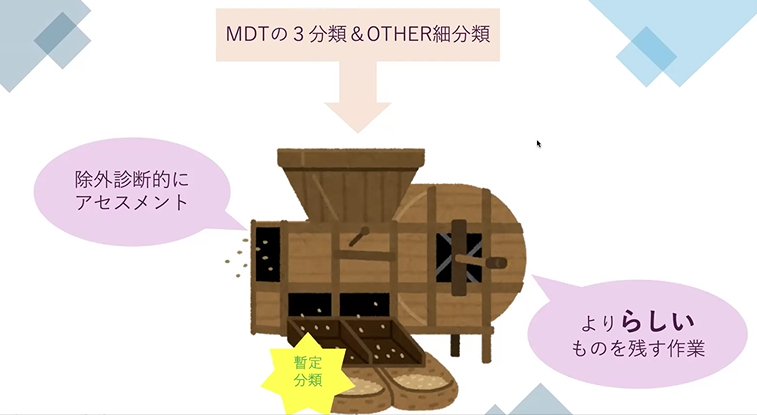 この除外診断的にイランもん、どんどん避けていくっていうな感じで、そこで暫定分類っていうのを決めて、で、介入したらどうかっていうのでアセスメントをしていきます。