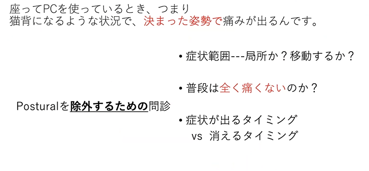 で、先ほどのですね、決まった姿勢で痛みが出るんですって聞いた時に、もしPosturalなのかなと思った時に、除外するための問診をちょっと、しっかりとしていきます。