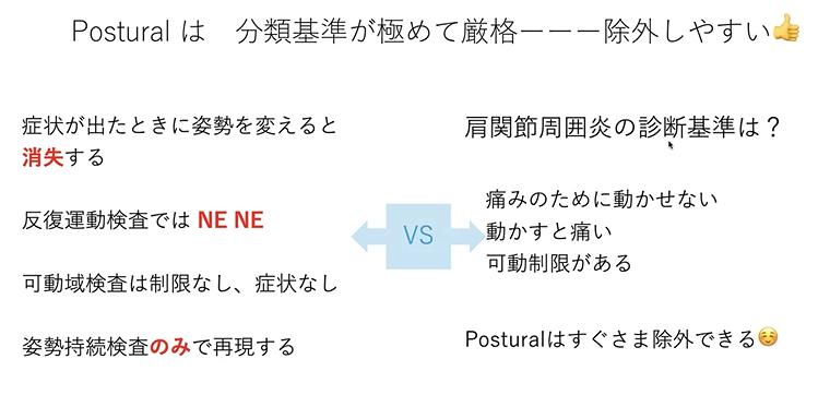 で、Posturalが除外しやすいってなぜかっていうと、分類条件が極めて厳格なので、問診で先にこう除外ができるもの