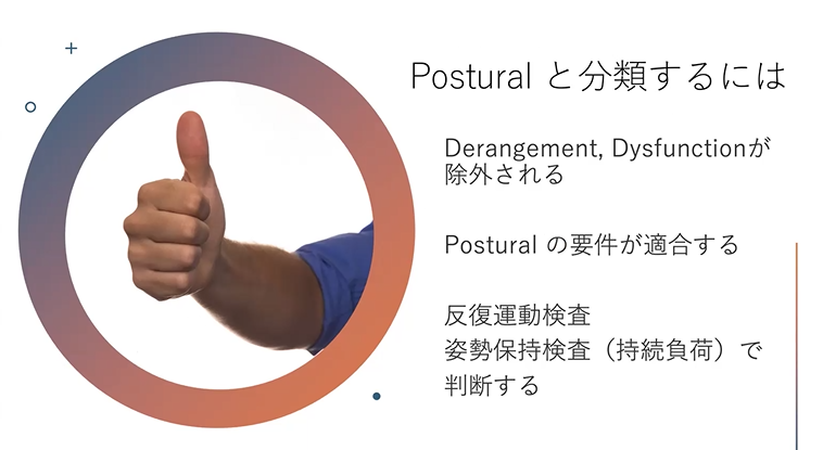 やっぱりPosturalと分類するって時には、まずDerangement、Dysfunctionがもう除外されている、その特徴が全くないってことの確認と、Posturalの要件を適合してるかどうかで、反復運動検査で全く変化がない。