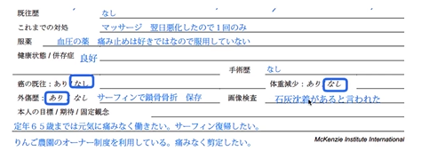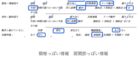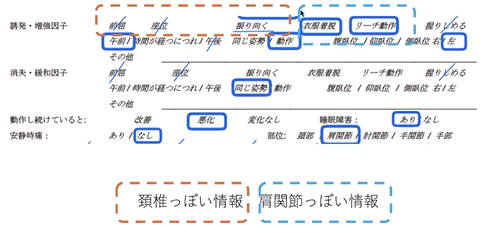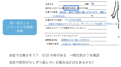 職業によって、要は、どんな動作によってっていう動作を続けていると、っていう時に、どんな動作で悪化するのかっての、ここで拾わせていただいて、