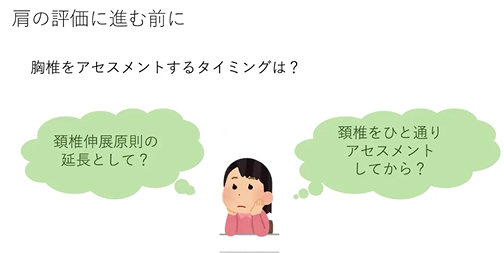 #これはやっぱ頸椎の反応が非常に良かったら、もうどんどん頸椎行くし、もうどうしようもない、頸椎ダメそうだなと思ったら、さっともう胸椎をね、アセスメントして、それでも変化がなかったらもう肩の評価にさっと入るっていうような感じで捉えていただければと思います。