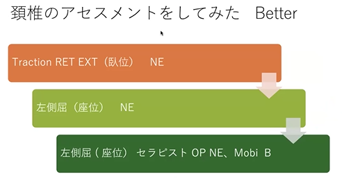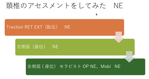 Traction-retruction-extensionって臥位でやる手技があるんですけど、これでしっかりやって、で、伸展はもう全然、もう反応が乏しいっていうんで、側屈方向にあって、最後mobilizatinでBetterってパターンですね。