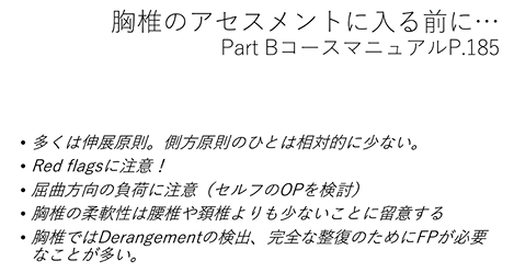 で、胸椎のアセスメントをしたいっていう時には、やっぱ頸椎の伸展の延長として、胸椎の伸展をやったりすることがあるんですけど、一応、注意の事項があって、やっぱり胸椎ってred flagsに関わる項目があるって言って、これはマニュアルのところに、パートbの方に、185ページってとこに書いてあるので、一応、胸椎に入るには、胸椎に入るという根拠を持ってやりましょうっていう感じの記載になっています。