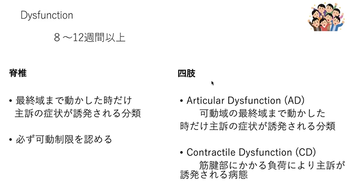 Dysfunctionっていうとね、なんかほら、皆さん、肩で、筋とか腱とか、ローテータカフとか滑液包炎とか、色々思いをね、巡らしていらっしゃると思うんですけれども、それ、そういったものも絡んできやすいっていう分類で、Dysfunctionっていうね、ものもあります。