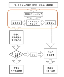で、チェックしても、また、やっぱ首を動かしても、何やっても変化ないなとなったら、四肢の負荷検査に入りますし、ちょっとでもなんかね、変わったっていうと、そこらへんはやっぱ、もうちょっと脊椎にこだわって、頑張って調べようよっていう感じになる、こういった流れがあります。