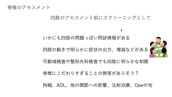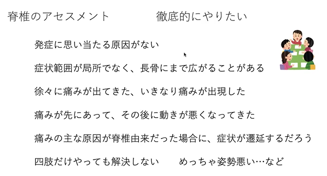 ケンイチロウさんの場合は、肩のアセスメント前にスクリーニングとしてやりたいなって、脊椎をね、まずやるっていうと、