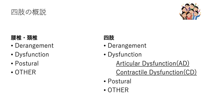 4つってか、メインが3つで、Derangement、Dysfunction、Posturalで、それに当てはまらないもの、Otherっていう分類があります。