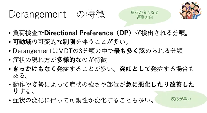Derangementっていう、MDTのね、分類があるんですけども、それは反復運動検査ね、繰り返しやるような動きとか、持続の負荷、じっと同じ負荷をかけるみたいなもので、Directional Preference(DP)ってのが検出される分類です。