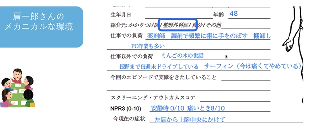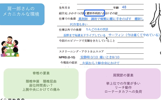 肩関節の要素としては、挙上位の作業が多いっていうと、やっぱりいつも通常の、いわゆる組織のところにいろんな負荷がかかってたんだろうなっていうのはあると思います。