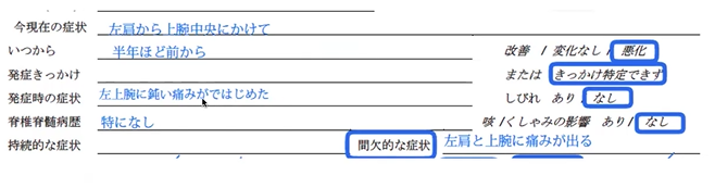 で、これ、これはね、ごっつあんっていうのも変ですけど、絶対脊椎みたい、上腕に鈍い痛みが出始めてて、それから、可動域が悪くなったみたいな感じの方。