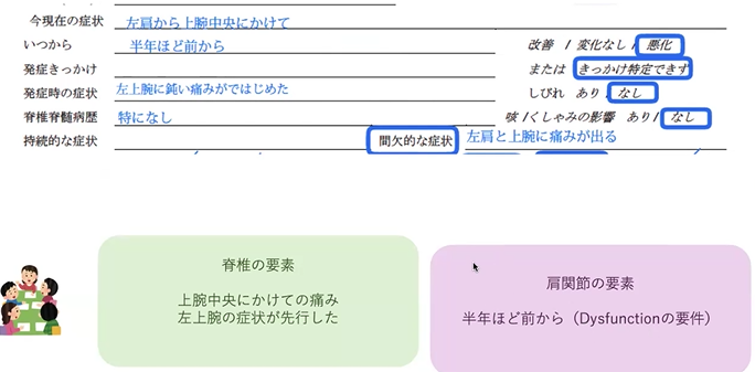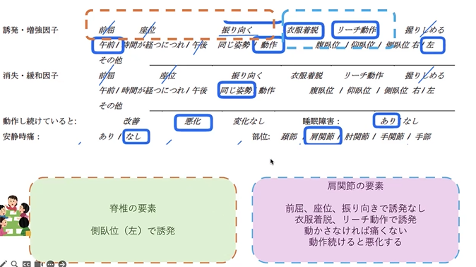 で、動かさなければ痛くないとか、動作を続けると悪化するっていうと、やっぱ肩の動きと関連あるかなっていう感じで整理してもいいかと思います。