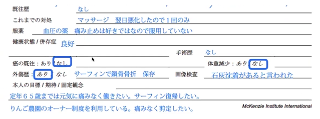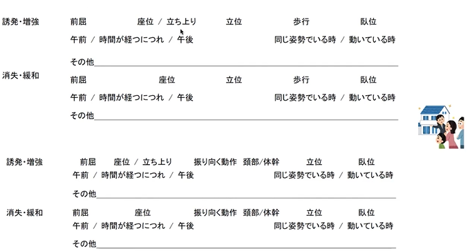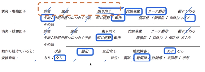で、この問診の中に、良くなる、悪化する、動作の反対が良くなるってこともあるので、やっぱり良くなる方向の情報を問診で集めていきます。