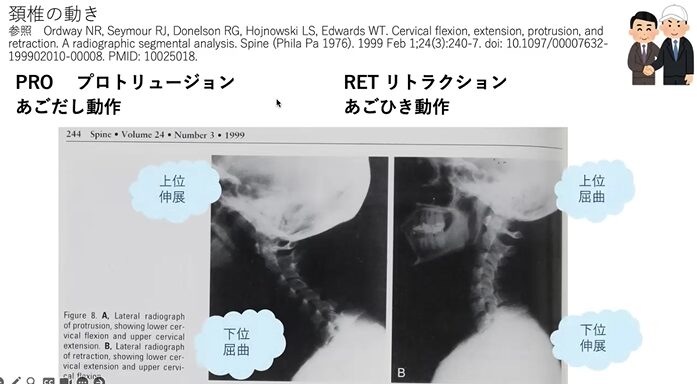 このリトラクションってのが、評価表にあるこのプロトリュージョンリトラクションっていう、これ、リトラクションして、今度上向いてエクステンションっていうね、そういうことになるんですけども、こういった動きを使って頸椎はアセスメントをしていきます。