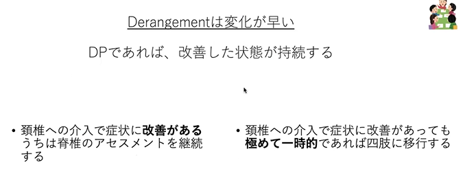 そうすると、頸椎の介入で症状に改善があるうちは、やっぱり脊椎のアセスメントにいきたいけれども、一時的にいいんだけども、極めて一時的ってことであったら、早期にね、四肢に行けばいいっていう感じになってる。