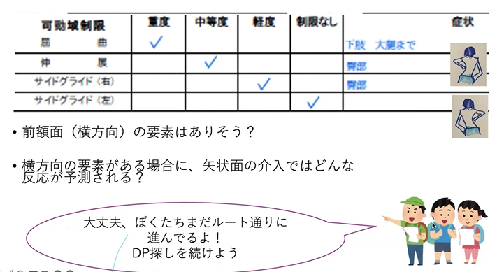 伸展方向の匂いがするとか、屈曲かって言って、矢状面で一生懸命やるんですけども、やっぱり思うような反応が出なかったり、かえって悪化しちゃったって言った時に、焦らないで、焦らないで問診の情報を見て、側方の要素があるのかなっていうの見ていて、もう今度は側方をね、加味した伸展方向っていうのを探索を始めます。