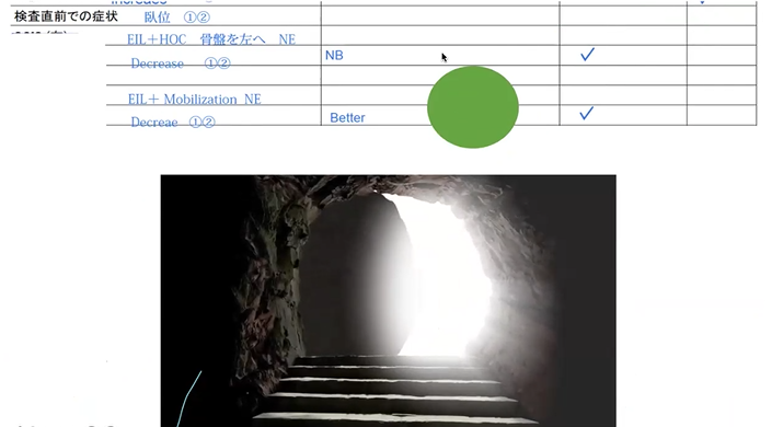 で、最後に、モビライゼーションっていうので、最後、ヒップオフセンターから負荷をね、かける方法なんですけども、モビライゼーゼーションをやったら、その時に痛みは変わらないで、でもやっているうちにどんどん痛みが減ってって、Betterが出ましたよっていうことで、緑がつきました。