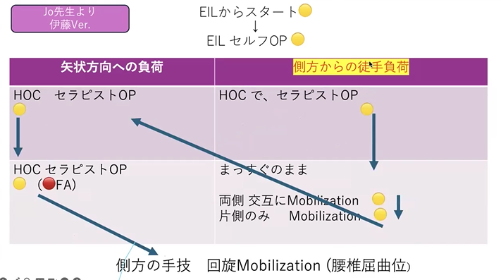 骨盤をこうずらしたHip off center(HOC)で、セラピストが上から負荷かけるとかって、矢状方向に負荷をかけるものとか、Mobilizationに行くって、
