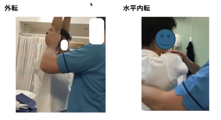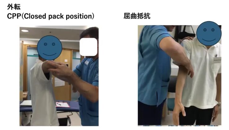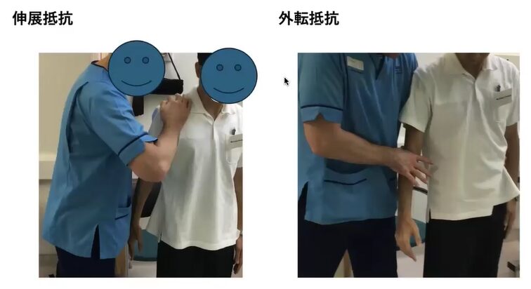 こういった、肩がこう、カツッと遊ばないような状態で、外転をかつっと、こう止めて、どこまでいくかっていう感じで分けます。