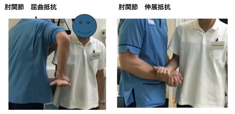 忘れちゃいけないのが、2頭筋の存在ですので、肘の関節の屈曲の抵抗運動と伸展方向はこう止めててねって言っといて、セラピストが下からぐっと押してやって、伸展方向に抵抗感、これを右左でやってくっていうのがジジョン先生の方法になります。