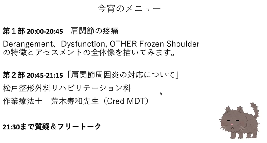 で、第2部に、肩関節周囲炎への対応ということで、松戸整形外科、リハビテーション科の作業療法士のアラキトシカズ様でよろしいですか。
