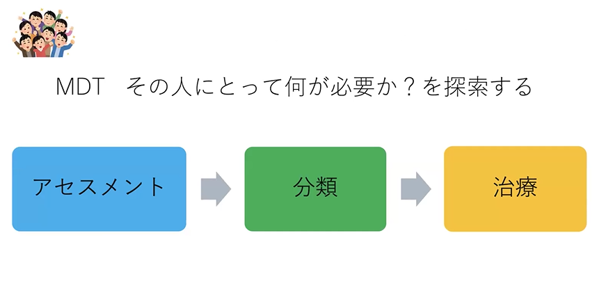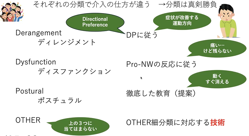 で、アセスメントをして、MDT分類、特徴のあるね、分類を、症状に応じて、あと、運動、動きや姿勢保持とかで、それによって得られた反応、症状の出方とか変化を、に従って分類をして、それに従って治療を決めていくっていう形になります。