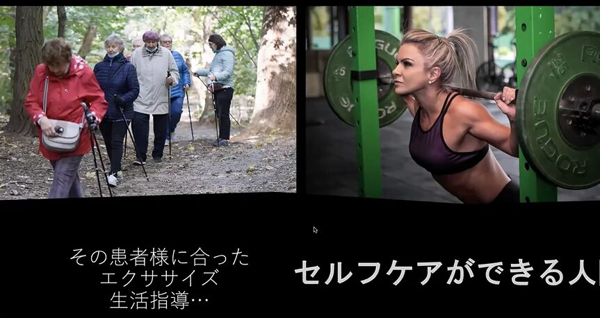 運動できる人もいれば、もうご高齢でいらっしゃる方で、その患者様に合ったエクササイズと生活指導をやっていくっていう趣旨。